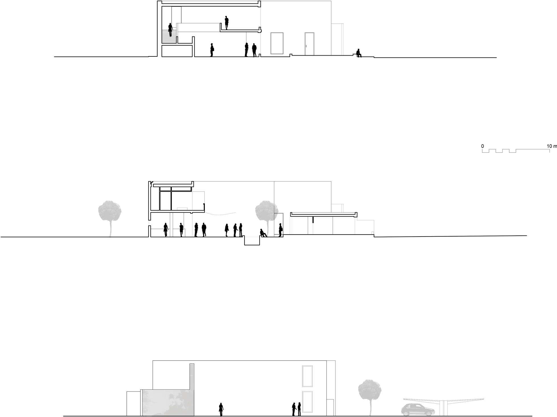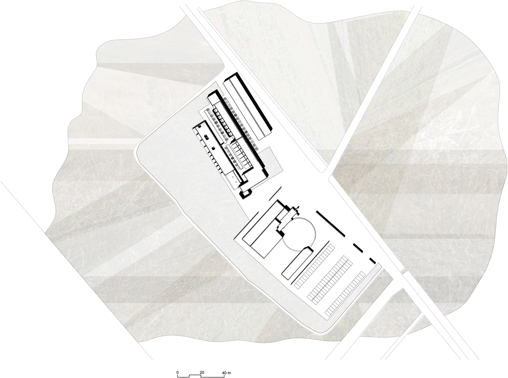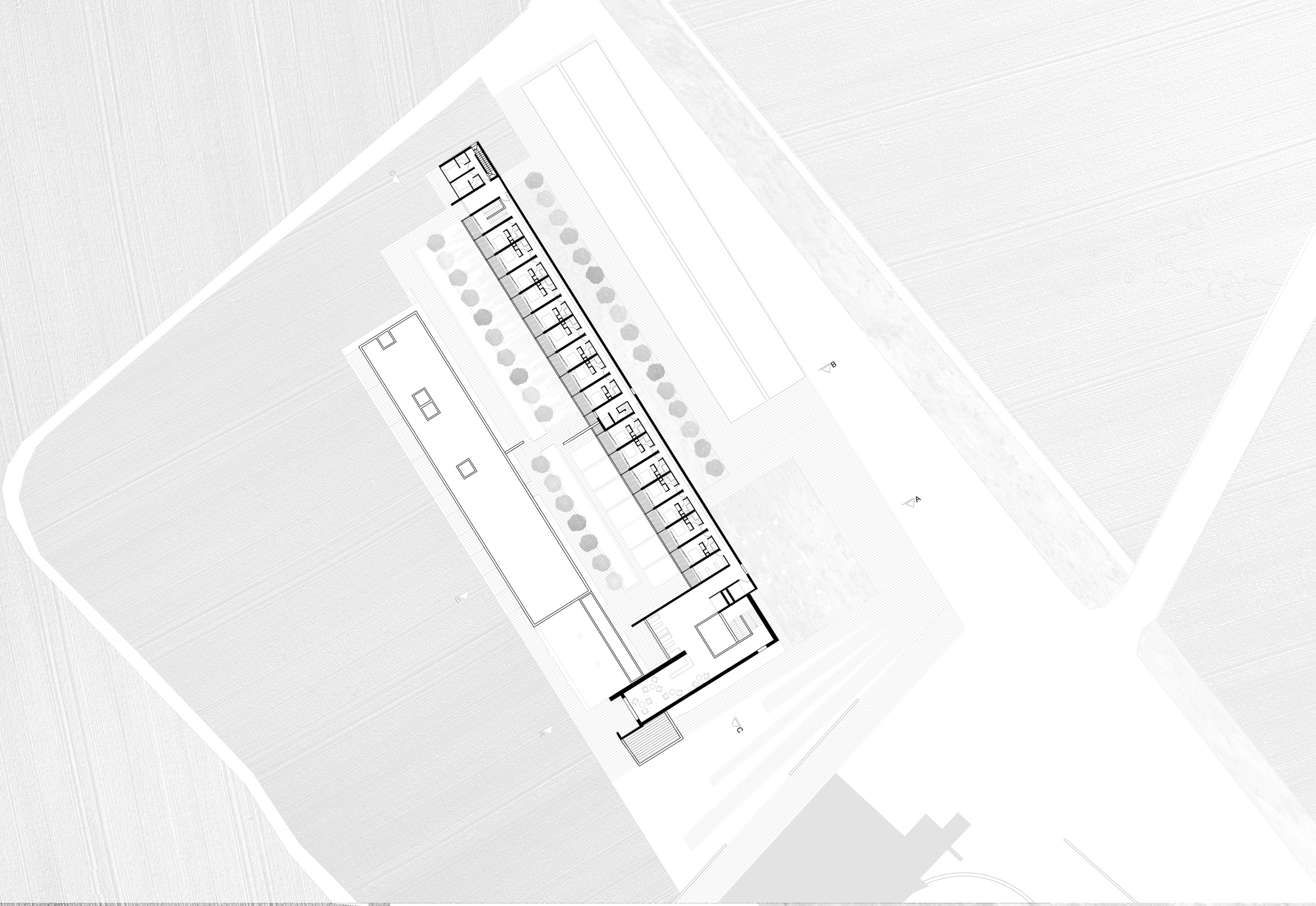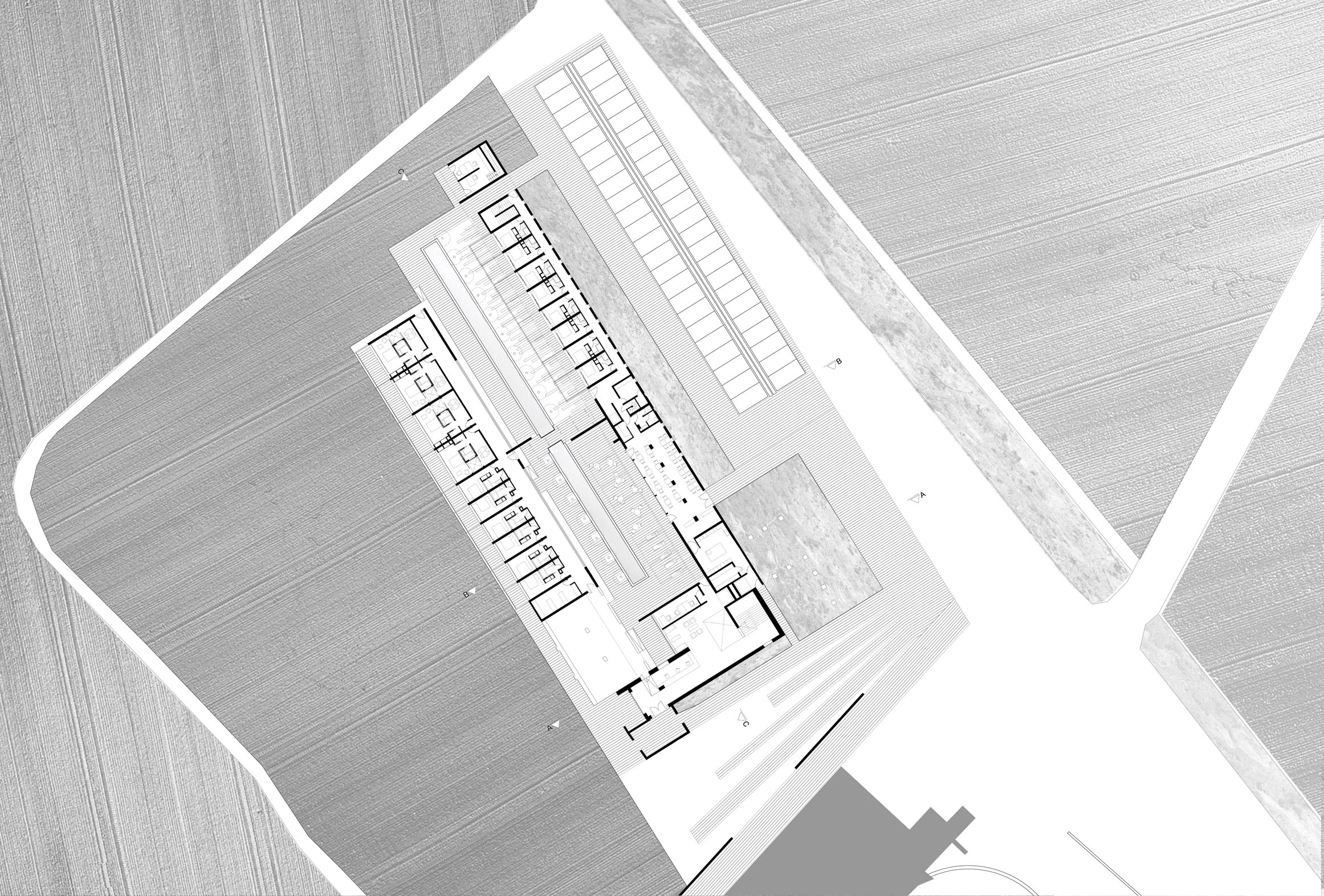Dans les Marismas du fleuve Guadalquivir, un paysage sans fin, entre eau, champs, vent et soleil. Cette ancienne ferme s’inscrit dans cette situation ambigüe, dans cette absence de limites ; si son expansion progressive s’est arrêtée, nous pouvons aujourd’hui continuer la logique qui voulait que le bâtiment cherche les limites infinies du paysage. En conservant quelques éléments significatifs des ruines du bâtiment, l’hôtel se dessine de manière très abstraite, pour mettre en valeur ces éléments. Les vues principales se dirigent vers le sud, vers les lumières de la ville d’Isla Mayor. L’ensemble se développe ainsi dans une seule direction, laissant au nord une façade neutre et horizontale. Le patio d’origine devient un lieu de vie et de repos à l’intérieur de l’hôtel, offrant toujours des vues vers le paysage immense.