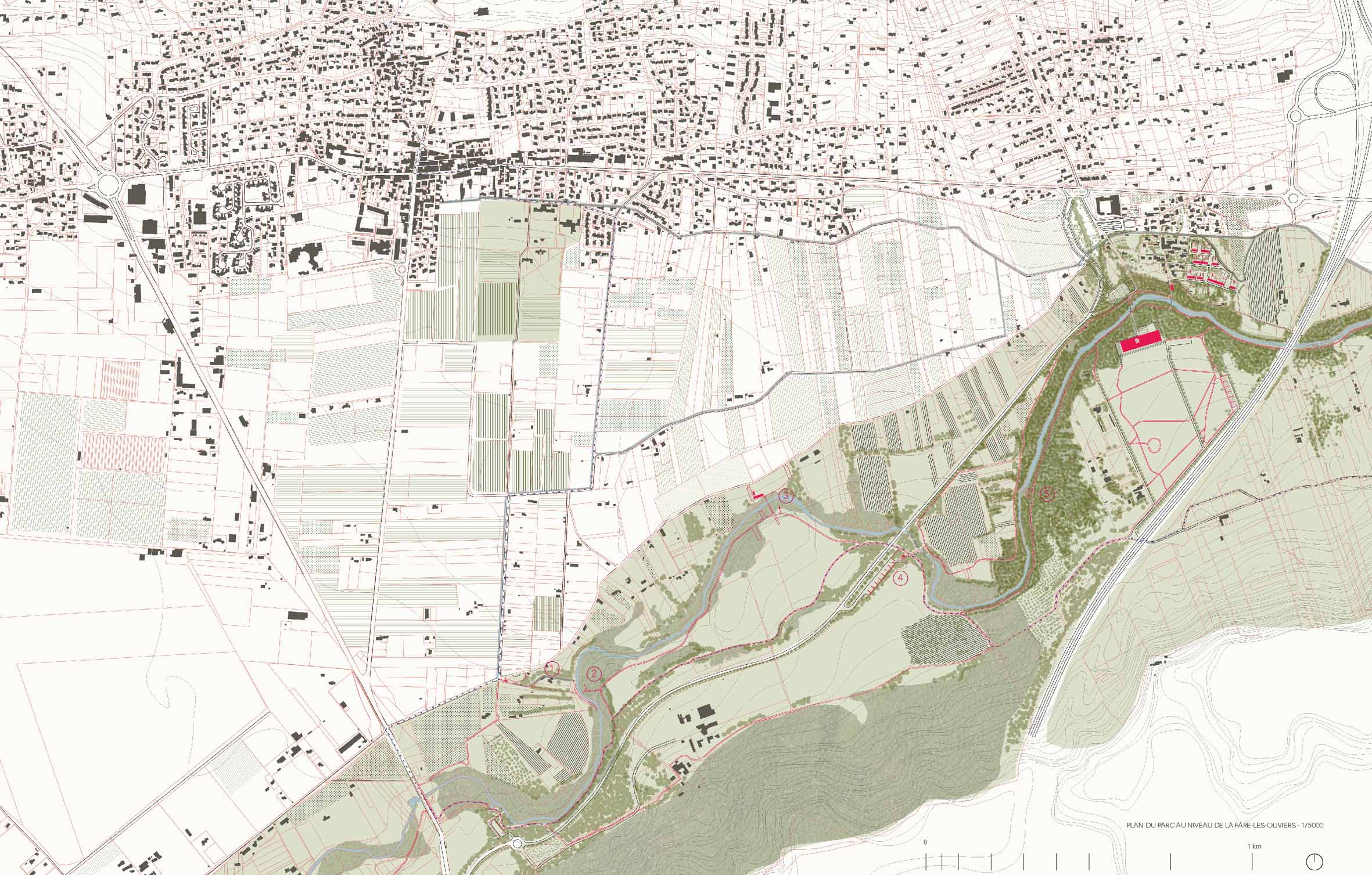 Une limite n’est qu’une ligne, et qu’elle se matérialise ou qu’elle reste fictive, elle se contente de déterminer une étendue. À la différence de la limite, la notion de lisière inclut une dimension d’épaisseur, et suggère que l’espace qu’elle contient est susceptible d’être habité. Nous pourrions dire que la lisière est le seuil du territoire, un espace de transition entre deux entités aux propriétés et aux identités différentes. Ce travail a l’ambition d’appliquer le concept de lisière à une limite communale, en repensant la position de cette séparation administrative dans le territoire métropolitain. Marquant une des portes d’entrée dans le Parc des Rives Est de l’Étang de Berre, la rivière L’Arc qui sépare Velaux et La Fare-les-Oliviers devient un lieu de rencontre pour commencer une promenade qui traverse les lisières de cette portion de métropole.